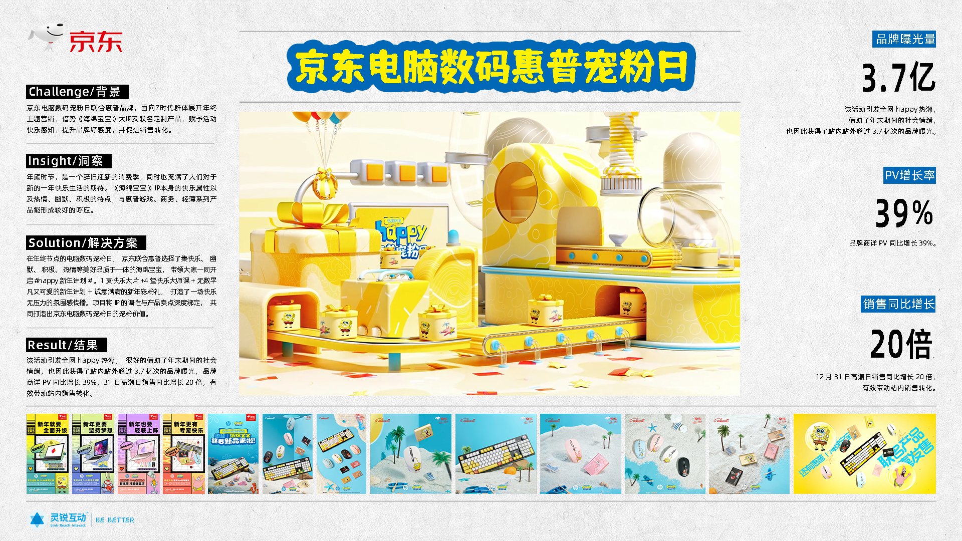 - 京東(dōng)電(diàn)腦(nǎo)數(shù)碼寵粉日(rì)聯合惠普品牌,面向Z時(shí)代群體(tǐ)展開(kāi)年(nián)終主題營銷,借勢《海(hǎi)綿寶寶》大(dà)IP及聯名定制(zhì)産品,賦予活動快(kuài)樂(yuè)感知(zhī),提升品牌好(hǎo)感度,并促進銷售轉化(huà)。