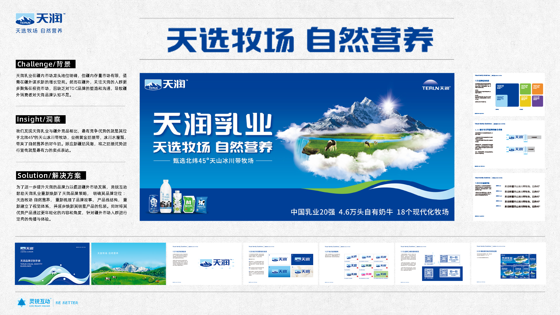 - 為(wèi)了(le)進一(yī)步提升天潤的(de)品牌力以促進疆外(wài)市(shì)場(chǎng)發展,靈銳互動幫助天潤乳業(yè)重新煥新了(le)天潤品牌,并明(míng)确其品牌定位,梳理(lǐ)了(le)産品線結構,逐步煥新其明(míng)星産品的(de)包裝。同時(shí)将其優勢産品通(tōng)過更年(nián)輕化(huà)的(de)內(nèi)容和(hé)角度,針對(duì)疆外(wài)市(shì)場(chǎng)人(rén)群進行(xíng)定向的(de)傳播與體(tǐ)驗。消費(fèi)者對(duì)于乳制(zhì)品的(de)需求十分(fēn)旺盛,在選購(gòu)牛奶時(shí)除口感、味道(dào)、價格等基礎信息外(wài),對(duì)綠(lǜ)色天然、高(gāo)營養、高(gāo)品質這(zhè)些(xiē)因素更為(wèi)關注。在這(zhè)種大(dà)衆消費(fèi)趨勢的(de)前提下(xià),天潤的(de)地(dì)域及自(zì)然優勢更加符合受衆的(de)消費(fèi)需求。此次升級,我們幫助天潤找到(dào)了(le)品牌全新定位:天選牧場(chǎng),自(zì)然營養,并诠釋出新的(de)品牌理(lǐ)念:天潤敬畏自(zì)然的(de)力量,矢志(zhì)與自(zì)然和(hé)諧相(xiàng)處,選用(yòng)天山(shān)南(nán)北(běi)的(de)優質奶源,結合創新的(de)技(jì)術(shù)優勢,成就(jiù)高(gāo)品質的(de)産品,獻于崇尚健康的(de)消費(fèi)者。