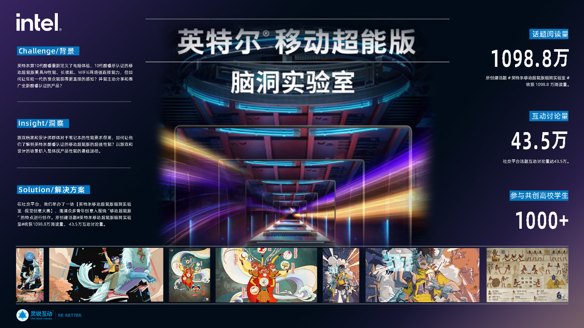 - 在社交平台,我們舉辦了(le)一(yī)場(chǎng)【英特爾移動超能(néng)版腦(nǎo)洞實驗室 視(shì)覺創意大(dà)賽】,邀請(qǐng)衆多(duō)青年(nián)創意人(rén)圍繞“移動超能(néng)版”的(de)特點進行(xíng)創作(zuò)。所創建話(huà)題#英特爾移動超能(néng)版腦(nǎo)洞實驗室#收獲1098.8萬閱讀(dú)量、 43.5萬互動討(tǎo)論量。