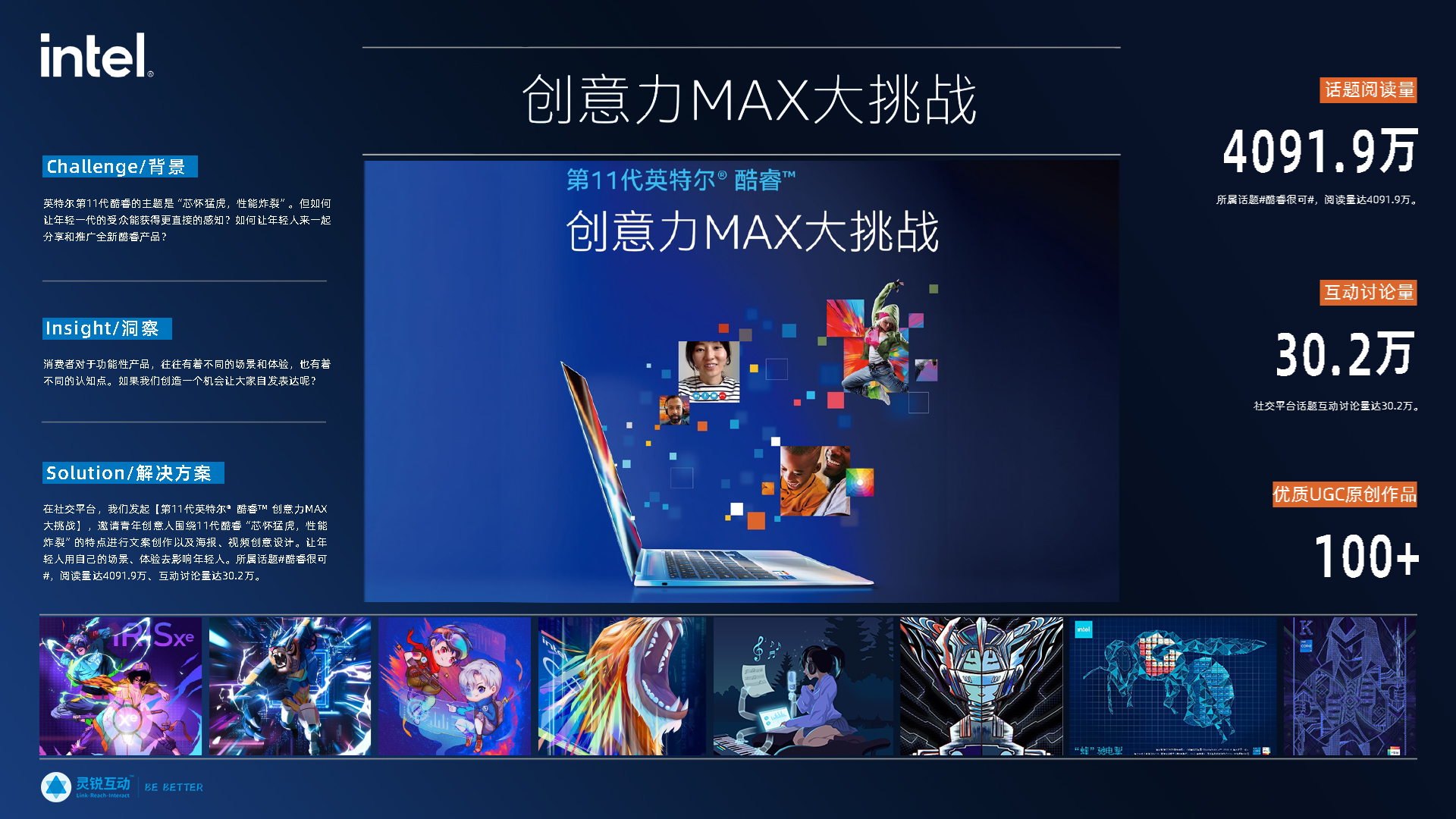 - 在社交平台,我們發起【第11代英特爾® 酷睿™ 創意力MAX大(dà)挑戰】,邀請(qǐng)青年(nián)創意人(rén)圍繞11代酷睿“芯懷猛虎,性能(néng)炸裂”的(de)特點進行(xíng)文(wén)案創作(zuò)以及海(hǎi)報(bào)、視(shì)頻(pín)創意設計(jì)。讓年(nián)輕人(rén)用(yòng)自(zì)己的(de)場(chǎng)景、體(tǐ)驗去(qù)影(yǐng)響年(nián)輕人(rén)。所屬話(huà)題#酷睿很(hěn)可(kě)#,閱讀(dú)量達4091.9萬、互動討(tǎo)論量達30.2萬。