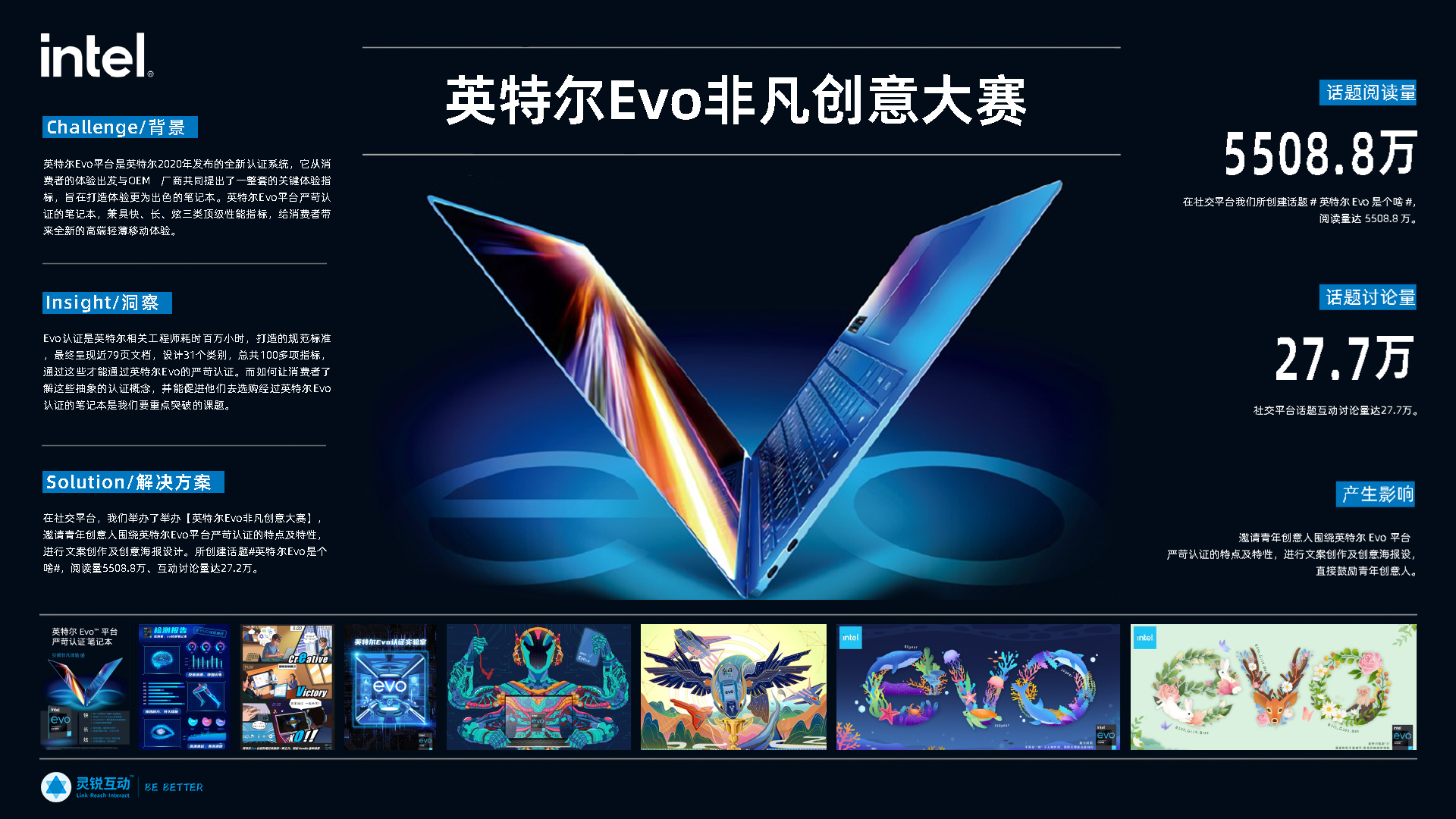 - 在社交平台,我們舉辦了(le)舉辦【英特爾Evo非凡創意大(dà)賽】,邀請(qǐng)青年(nián)創意人(rén)圍繞英特爾Evo平台嚴苛認證的(de)特點及特性,進行(xíng)文(wén)案創作(zuò)及創意海(hǎi)報(bào)設計(jì)。所創建話(huà)題#英特爾Evo是(shì)個(gè)啥#,閱讀(dú)量5508.8萬、互動討(tǎo)論量達27.2萬。